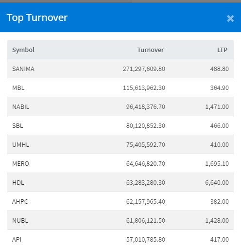 त्यस्तै, माछापुच्छ्रे बैंकको ११ करोड ५६ लाख, नबिल बैंकको ९करोड ६४ लाख, सिद्धार्थ बैंकको ८ करोड १ लाख र युनाइटेड मोदी हाइड्रोपावरको ७ करोड ५ लाख भन्दा माथिको कारोबार भएको छ ।