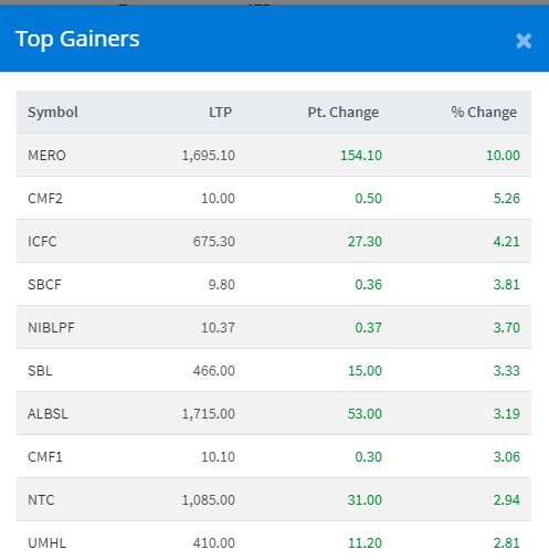 आज नेप्से परिसूचक १४ अंकले घट्दा पनि मेरो माइक्रोफाइनान्सको शेयरमा भने पोजेटिभ सर्किट लागेको छ । त्यस्तै, सिटिजन्स म्युचुअल फण्डको ५.२६ प्रतिशत अंक, आइसिएफसि फाइनान्सको ४.२१ प्रतिशत अंक, सनराइज ब्लुचिप फण्डको ३.८१ प्रतिशत अंक र एनआइबिएल प्रगति फण्डको ३.७० प्रतिशत अंकले बृद्धि भएको छ ।