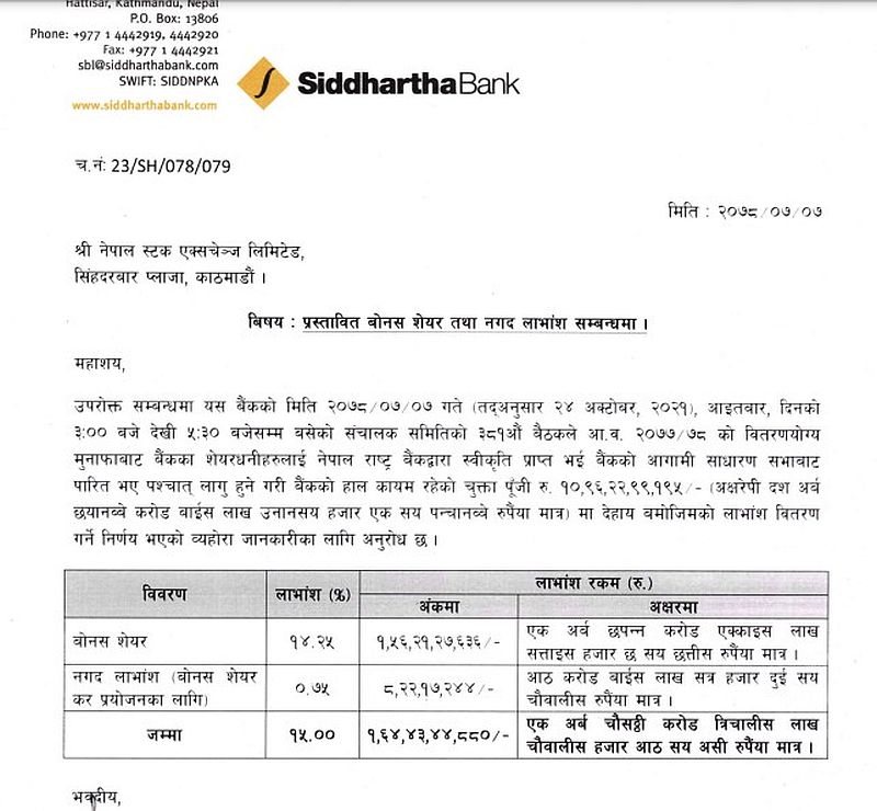 सिद्धार्थ बैंकको लाभांश घोषणा, बोनस र नगद कति ?