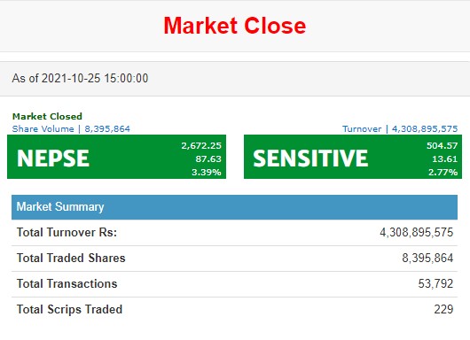 नेप्सेमा सूचिकृत २२९ कम्पनीको ८३ लाख ९५ हजार ८६४ कित्ता शेयर किनबेच हुँदा ४ अर्ब ३० करोड ८८ लाख ९५ हजार ५७५ रुपैयाँको कारोबार भएको छ ।