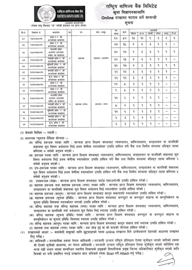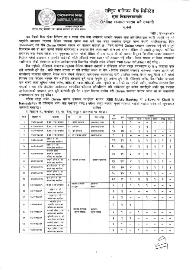 ९ औं तहको लागि बरिष्ठ प्रबन्धकदेखि तह ५ को बरिष्ठ सहायक (सूचना प्रविधिसम्म) का लागि आवेदन माग गरिएको हो । बैंकले २ जना वरिष्ठ प्रबन्धक, ६ जना प्रबन्धक, १८ जना उपप्रबन्धक (प्रशासन), १ जना उपप्रबन्धक (लेखा) माग गरेको छ ।