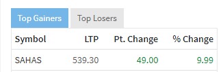 काठमाडौं । साताको तेस्रो दिन मंगलबार शेयर बजार खुलेको करिब एक डेढ घण्टाको अवधिमा साहज उर्जाको शेयर ९.९९ प्रतिशतले बृद्धि भएको छ ।