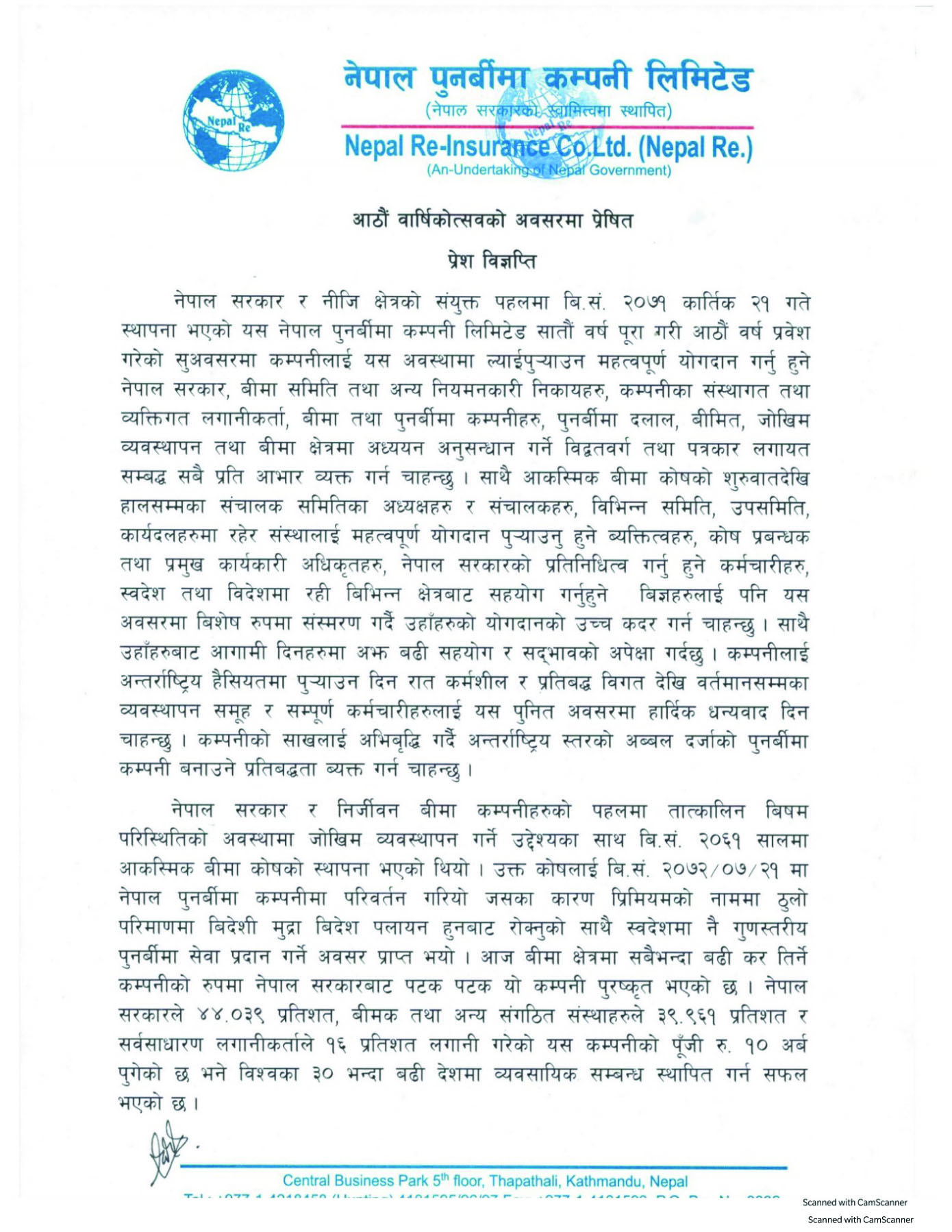 नेपाल पुनर्बीमा कम्पनी स्थापनाको आठौं बार्षिकोत्सव मनाइरँदा कम्पनीले विदेशबाट समेत करोडौं रुपैयाँ बीमा शुल्क नेपाल भित्राई विदेशी मुद्रा आर्जन गर्ने एक मात्र सेवामूलक व्यवसाय बन्न सफल भएको छ । १० अर्ब चुक्ता पुँजि भएको कम्पनीले छोटो अवधीमा नै प्रगतिपथमा लम्किन सफल भइसकेकोछ । आठौं बार्षिकोत्सवको अवसरमा बीमापोष्टको तर्फबाट पनि हार्दिक बधाई तथा शुभकामना ।