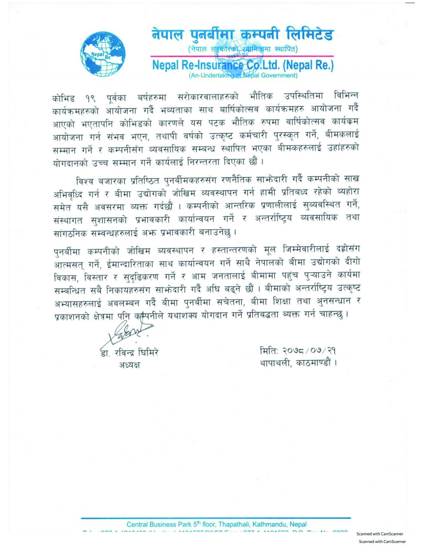 सात वर्ष पुरा गरी आठौं वर्षमा प्रवेश गरेको अवसरमा नेपाल पुनर्बीमा कम्पनीका अध्यक्ष डा. रविन्द्र घिमिरेले अन्तर्राष्ट्रिय जगतका सामू विश्वासयोग्य कम्पनीको रुपमा स्थापित गराएर कम्पनीको अन्तर्राष्ट्रिय व्यवसायमा बृद्धि गर्ने प्रतिबद्धता जनाएका छन् । बार्षिकोत्सवको अवसरमा अध्यक्ष डा. घिमिरेले शुभकामना सन्देश दिँदै भने, ‘कम्पनीले छोटो अवधीमा राम्रो अन्तर्राष्ट्रिय छवी बनाउन सफल भएको छ, नेपालबाट बार्षिक अर्बौ रुपैयाँ विदेश जान जोगिएको छ, अन्तर्राष्ट्रिय मुद्रा आर्जन गर्ने देशकै गौरवयोग्य कम्पनीको रुपमा स्थापित बनेको छ । यसमा योगदान दिने नेपाल सरकार, शेयर लगानीकर्ताहरु, पूर्व प्रशासकहरु, सबै कर्मचारीहरु, बीमा कम्पनीहरु, पुनर्बीमा एजेन्टहरु र नियामक निकायसहित सबैलाई हार्दिक धन्यवाद ज्ञापन गर्दै आगामी दिनमा अझै विश्वासयोग्य कम्पनीको रुपमा स्थापित गरेर उत्कृष्ट पुनर्बीमा सेवा प्रवाह गर्ने प्रतिबद्धता जाहेर गर्दछौं।’