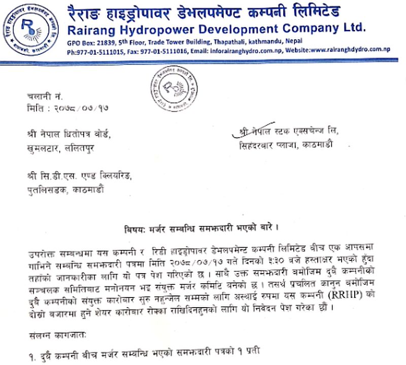 दुवै कम्पनीहरुबीच कात्तिक १७ गते मर्जर सम्बन्धी सहमतिपत्रमा हस्ताक्षर भएको थियो । उक्त समझदारी बमोजिम दुवै कम्पनीको सञ्चालक समितिबाट मनोनयन भई संयुक्त मर्जर कमिटि बनेको समेत कम्पनीले जानकारी दिएको छ ।दुवै कम्पनीको संयुक्त कारोबार सुरु नहुन्जेलसम्मका लागि अस्थायी रुपमा कम्पनीको सेयर कारोबार रोक्का गरिदिन रैराङ हाइड्रोपावरले आग्रह गरेको छ।
