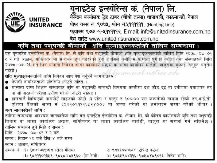 काठमाडौं । यूनाइटेड इन्स्योरेन्स कम्पनी लिमिटेडले कृषि तथा पशुपन्छी बीमाको क्षति मुल्याङ्कनकर्ताको तालिम दिने भएको छ । उक्त तालिम सुदुरपश्चिम प्रदेशको अछाम जिल्लाको साँफेबगरमा मंसिर १ र २ गते बिहान १० बजेदेखि ४ बजेसम्म सञ्चालन गर्ने लागेको हो ।