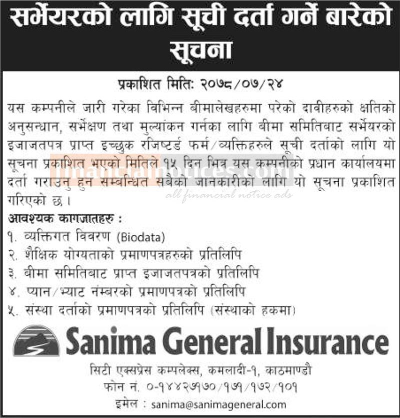 कम्पनीले जारी गरेका विभिन्न लेखहरुमा परेको दाबीहरुको क्षतिको अनुसन्धान, सर्भेक्षण तथा मूल्यांकन गर्नका लागि बीमा समितिबाट सर्भेयरको इजाजतपत्र प्राप्त इच्छुक रजिष्टर्ड फर्म।व्यक्तिहरुले सूची दर्ताको लागि १५ दिनभित्र उक्त कम्पनीको प्रधान कार्यालयमा दर्ता गराउन आह्वान गरेको हो ।