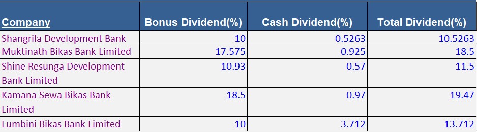 यसैगरी लुम्बिनी विकास बैंकले १३ दशमलव ७१२ प्रतिशत लाभांश प्रस्ताव गरेको छ। बैंकले १० प्रतिशत बोनस र ३ दशमलव ७१२ प्रतिशत नगद लाभांश प्रस्ताव गरेको छ।सांग्रिलाले १० प्रतिशत बोनस र ० दशमलव ५२६३ प्रतिशत नगद गरी कुल १० दशमलव ५२६३ प्रतिशत लाभांश घोषणा गरेको छ।शाइन रेसुंगाले १० दशमलव ९३ प्रतिशत बोनस र ० दशमलव ५७ प्रतिशत नगद गरी कुल ११.५ प्रतिशत लाभांश घोषणा गरेको छ।