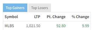 कम्पनीको अघिल्लो कारोबार दिनको तुलनामा शेयर ९.९९ प्रतिशत अर्थात् ९२ रुपैयाँ ८० पैसाले बढेर शेयरमूल्य १०२१ रुपैयाँ ५० पैसा पुगेको छ ।