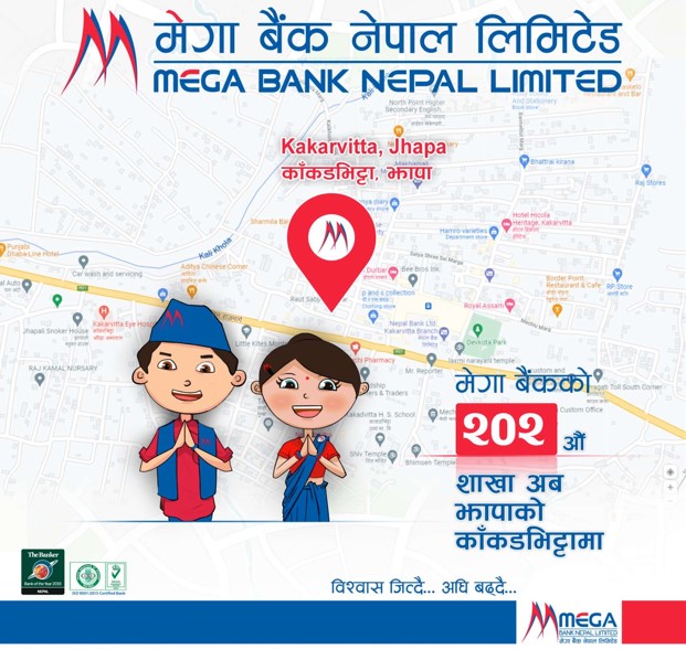 काठमाडौं । मेगा बैंक नेपाल लिमिटेडले काँकडभिट्टामा नयाँ शाखा विस्तार गरेको छ ।प्रदेश नं. १ स्थित झापा जिल्लाको मेचीनगर नगरपालिका वडा नम्बर ६ काँकडभिट्टामा मेगा बैंकले नयाँ शाखा विस्तार गरेको हो । यो मेगा बैंकको २०२औं शाखा हो ।