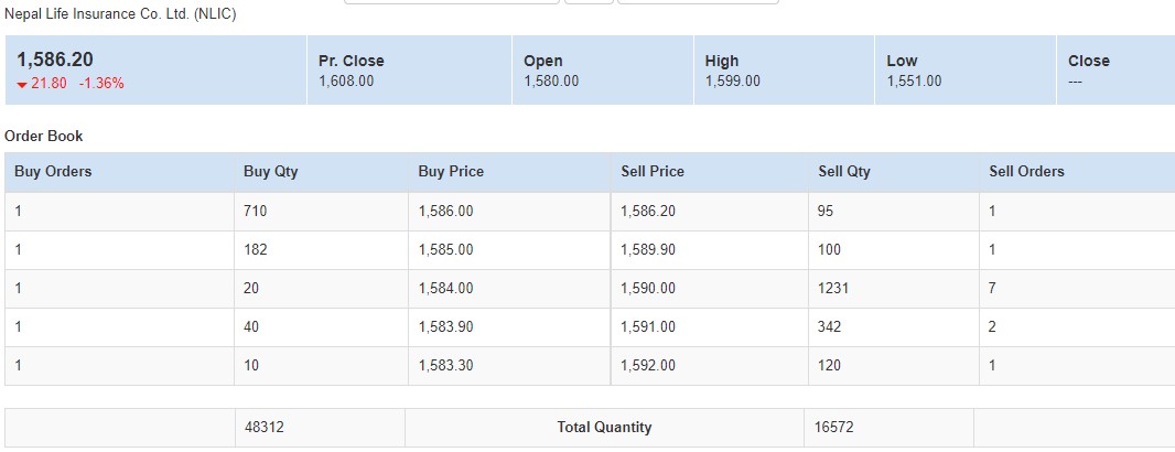 साताको तेस्रो दिन आज बजार खुलेको डेढ घण्टाको अवधिमा नेपाल लाइफ इन्स्योरेन्सको सर्वाधिक शेयर खरीदविक्री भएको छ । नेप्सेमा सूचीकृत अन्य कम्पनीहरुकोेनेपाल लाइफको आज सर्वाधिक खरीदविक्री भएको हो । यो समाचार तयार पार्दासम्म कम्पनीको शेयरमूल्य प्रतिकित्ता रू. १ हजार ५८६ रुपैयाँ २० पैसामा मा कारोवार भइरहेको छ ।