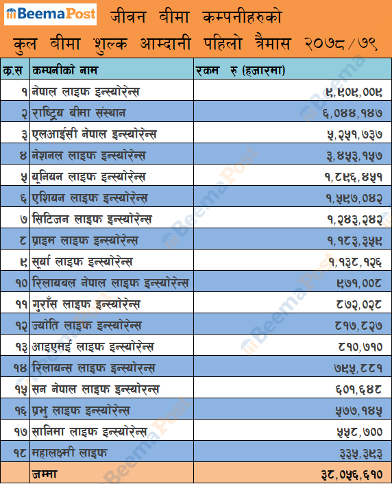१८ स्वदेशी जीवन बीमा कम्पनीले तीन महिनामा संकलन गरे ३८ अर्ब कुल बीमाशुल्क, कुनको कति ?