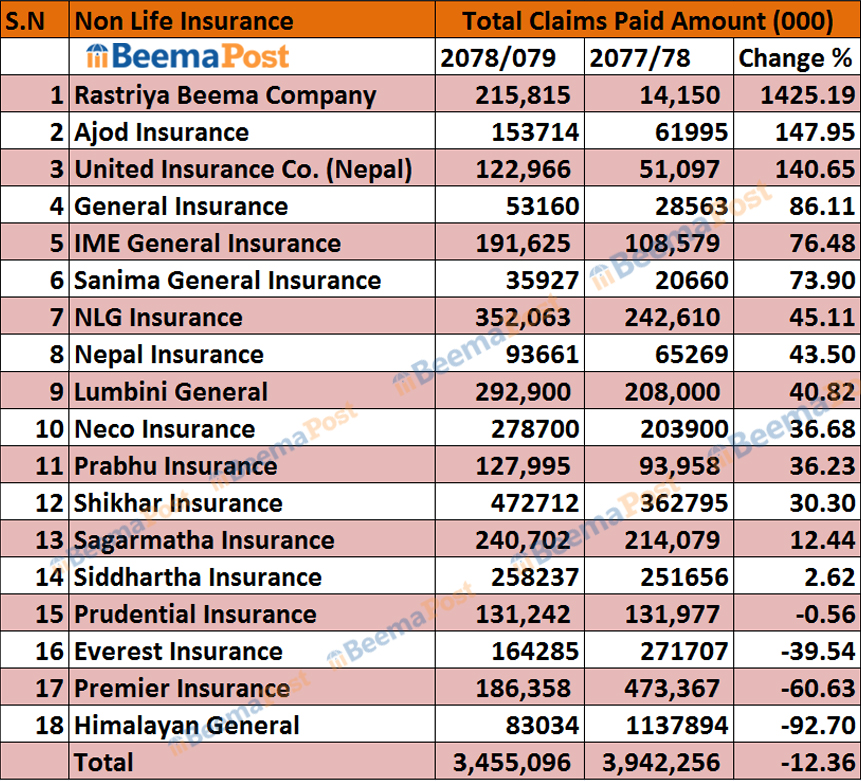 त्यस्तै लुम्बिनी जनरल इन्स्योरेन्स कम्पनीको ४० प्रतिशत, नेको इन्स्योरेन्स कम्पनीको ३६.६८ प्रतिशत, प्रभु इन्स्योरेन्स कम्पनीको ३६.२३ प्रतिशत, शिखर इन्स्योरेन्स कम्पनीको ३०.३० प्रतिशत, सगरमाथा इन्स्योरेन्स कम्पनीको १२.४४ प्रतिशत र सिद्धार्थ इन्स्योरेन्स कम्पनीको २.६२ प्रतिशतले कूल दावी भुक्तानी बढेको वित्तिय विवरणमा देखिएको छ ।