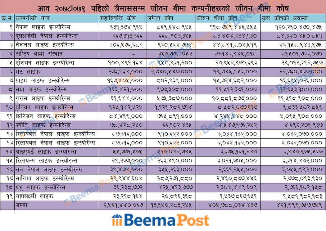 १९ वटै कम्पनीहरुले जीवन बीमा कोषमा कूल चार खर्ब पाँच अर्ब ७८ करोड ८० लाख ३४ हजार ४३७ रुपैयाँ जम्मा गर्न सफल भएका छन् । १९ वटै जीवन बीमा कम्पनीहरुले जगेडा कोषमा १३ अर्ब ६५ करोड दुई लाख ८३ हजार २५५ रुपैयाँ जम्मा गरेका छन् । त्यस्तै महाविपत्ति कोषमा सबै जीवन बीमा कम्पनीहरुले दुई अर्ब ५६ करोड १४ लाख ४० हजा ६७ रुपैयाँ जम्मा गरेका छन् ।