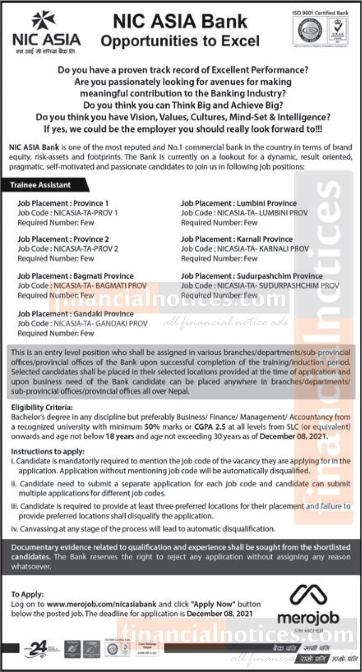योग्यता पुगका इच्छुक ब्यक्तिले मंसिर २२ गतेसम्म बैंकको वेवसाइट https://merojob.com/employer/nic-asia-bank/ मार्फत अनलाइन आवेदन दिन सक्नेछन् ।