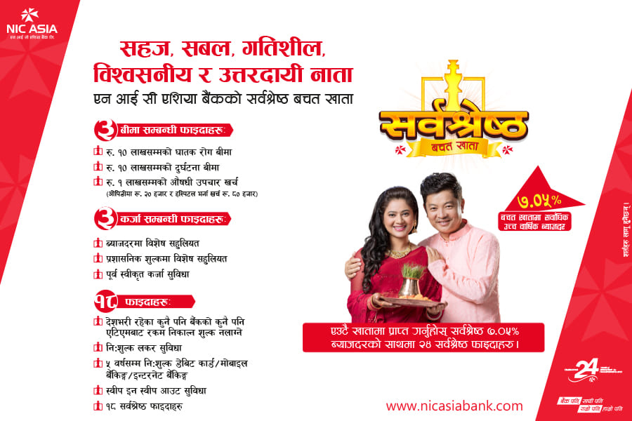 एनआईसी एशिया बैंकले ल्यायो ‘सर्वश्रेष्ठ’ बचत खाता, ७.५% बार्षिक ब्याजदरका साथै १० लाखसम्मको बीमा सुविधा