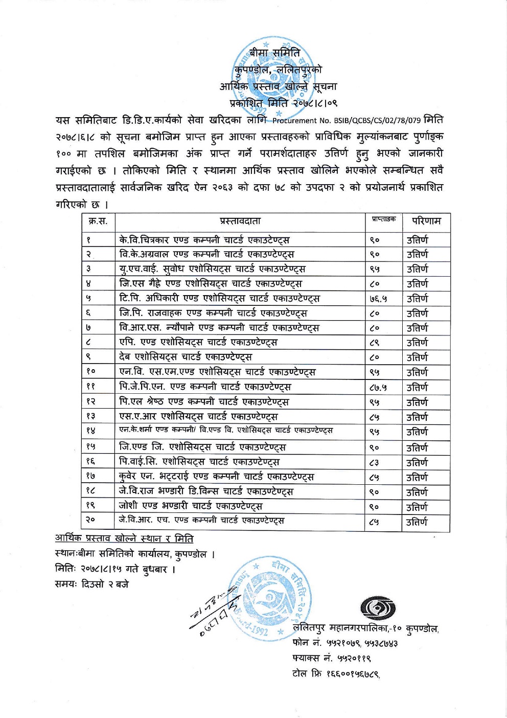काठमाडौं । बीमा समितिले बीमा कम्पनीहरुको डिडिएका लागि प्रस्ताव पेश गरेका मध्ये २० वटा चार्टर्ड एकाउन्टेन्सी फर्मको नतिजा सार्वजनिक गरेको छ । समितिले असोज ८ गते आर्थिक वर्ष २०७८/७९ मा समितिबाट डिडिए गर्नुपर्ने गरी पहिचान भएका बीमा कम्पनीहरुमा डिडिए गर्न इच्छुक चार्टर्ड एकाउन्टेन्सी फर्म वा कम्पनीहरुबाट प्राविधिक तथा आर्थिक प्रस्ताव आह्वान गरेको थियो । उक्त प्रस्तावित विवरणको नामावली समतिले आज सार्वजनिक गरेको हो ।