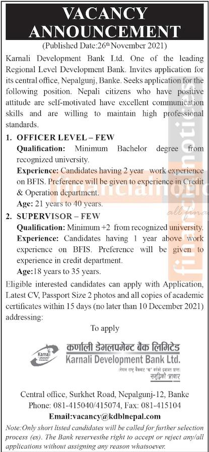 बैंकले केन्द्रिय कार्यालय नेपालगंज, बाँकेका लागि अफिसर लेभल र सुपरभाइजर पदका लागि केही संख्यामा कर्मचारी माग गरेको हो । कम्पनीले अफिस लेभलका लागि स्नातक तह उत्तीर्ण र सुपरभाइजरका लागि न्यूनतम प्लस टु उत्तीर्ण भएको हुनुपर्ने जनाएको छ ।