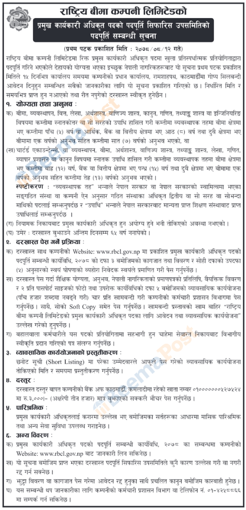 राष्ट्रिय बीमा कम्पनीद्वारा सिईओ पदमा दरखास्त आह्वान, कसले कसले दिन पाउँछन आवेदन ?