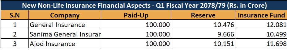 बीमा कोषको आधारमा जनरल इन्स्योरेन्स अगाडि रहेको छ । कम्पनीको बीमा कोषमा १२ करोड रुपैयाँ रहेको छ। त्यस्तै, अजोड इन्स्योरेन्सको ११ करोड ६९ लाख रुपैयाँ र सानिमा जनरल बीमा १० करोड रुपैयाँ ४९ लाख रुपैयाँ रहेको छ।