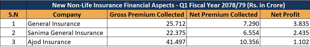 त्यस्तै, जनरल इन्स्योरेन्सले ७ करोड २९ लाख रुपैयाँ र सानिमा जनरल इन्स्योरेन्सले ६ करोड ५५ लाख रुपैयाँ खुद बीमाशुल्क आर्जन गर्न सफल भएको छ ।