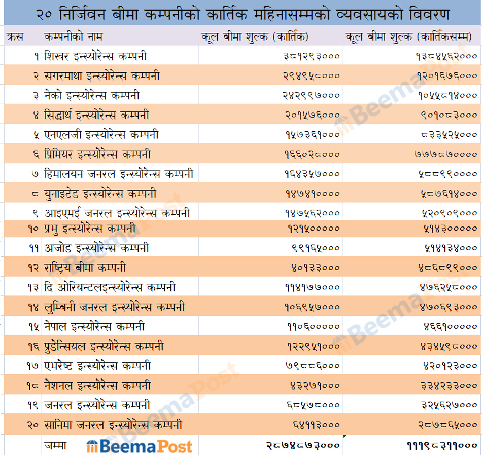 कार्तिक महिनासम्ममा २० निर्जिवन बीमा कम्पनीले संकलन गरे ११ अर्ब बीमा शुल्क, शिखरको झण्डै डेढ अर्ब, अन्य कम्पनीको कति ?
