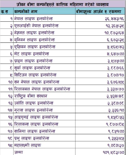 जीवन बीमा कम्पनीहरुले कात्तिकमा आर्जन गरे १० अर्बभन्दा बढि बीमाशुल्क, कुनले कति गरे ?