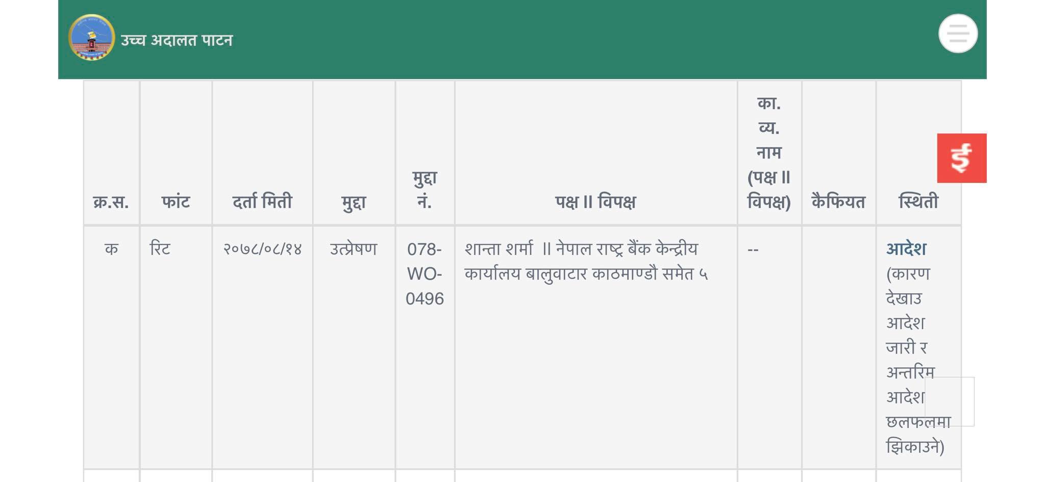 ग्रिन हिल सिटीमा घर खरिद गरी हालसम्म पनि घर प्राप्त नगरेकी पीडित शान्ता शर्माका वारेस अधिवक्ता सुमन न्यौपानेले दायर गरेको रिटमाथि सनुवाई गर्दै उच्च अदालत पाटनका न्यायाधिश नृपध्वज निरौलाको इजलाशले आज नेपाल राष्ट्र बैंकको नाममा अन्तरिम आदेश जारी गरेको हो ।