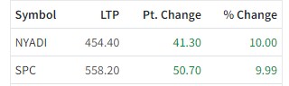 अघिल्लो कारोबार दिनको तुलनामा न्यादी हाइड्रोपावरको शेयर १० प्रतिशतले बृद्धि भएर शेयरमूल्य ४५४ रुपैयाँ ४० पैसा पुगेको छ । त्यस्तै, सामलिङ पावरको अघिल्लो कारोबार दिनको तुलनामा ९.९९ प्रतिशत अर्थात ५० रुपैयाँ ७० पैसाले बृद्धि भएर ५५८ रुपैयाँ २० पैसा पुगेको छ ।