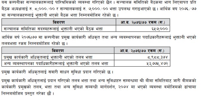 गत आर्थिक वर्षमा कम्पनीले अन्य व्यवस्थापनका पदाधिकारीहरूलाई भुक्तानी भएको तलव भत्ता उपलब्ध गराएको ५ करोड ३७ लाख समेत पारित गरेको हो ।