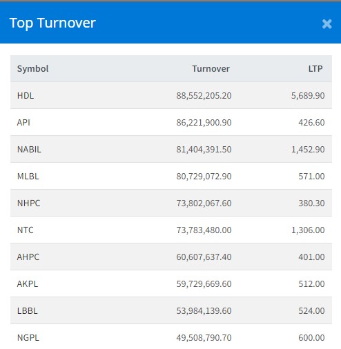 त्यस्तै, अपि पावर कम्पनीको ८ करोड ६२ लाख, नबिल बैंकको ८ करोड १४ लाख, महालक्ष्मी विकास बैंकको ८ करोड ७ लाख र नेशनल हाइड्रोपावरको ७ करोड ३८ लाख माथिको कारोबार भएको छ ।