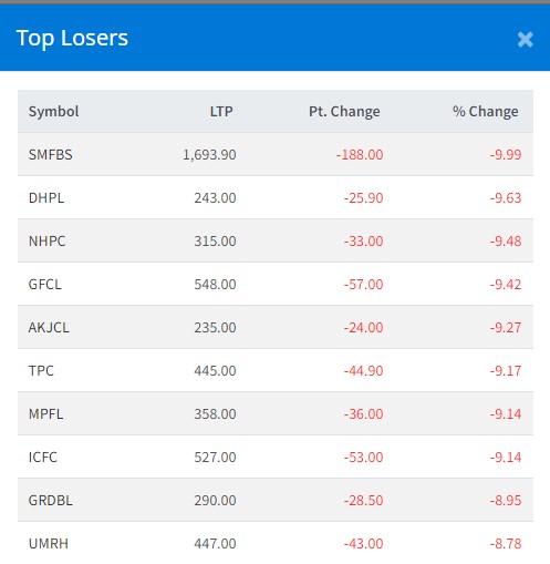त्यस्तै, अन्य सर्वाधिक गुमाउने कम्पनीहरुमा नेशनल हाइड्रो पावरको ९.४८ प्रतिशत, गुडवइल फाइनान्सको ९.४२ प्रतिशत, अन्खु खोला जलविद्युतको ९.२७ प्रतिशत, तेह्रथुम पावरको ९.१७ प्रतिशत, मल्टीप्रपोज फाइनान्सको ९.१४ प्रतिशत र आइसीएफसी फाइनान्सको ९.१४ प्रतिशतले घटेको हो ।