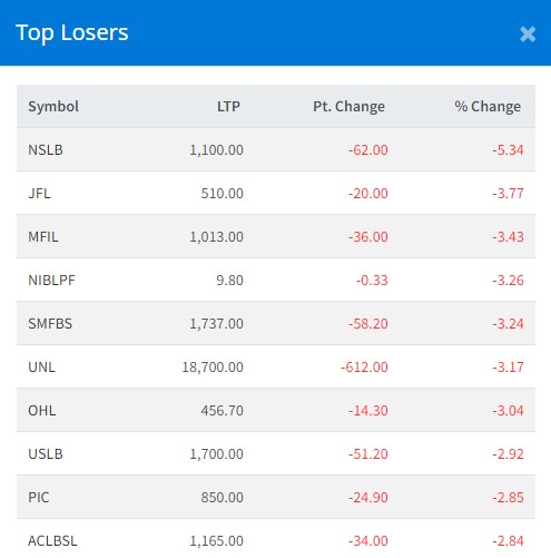 त्यस्तै, एनआइबिएल प्रगति फण्डको ३.२६ प्रतिशत, स्वाभिमान लघुवित्तको ३.२४ प्रतिशत, यूनिलिभर नेपालको ३.१७ प्रतिशत, ओरियन्टल होटलको ३.०४ प्रतिशत र उन्नति सहकार्य लघुवित्तको २.९२ प्रतिशतले घटेको हो ।