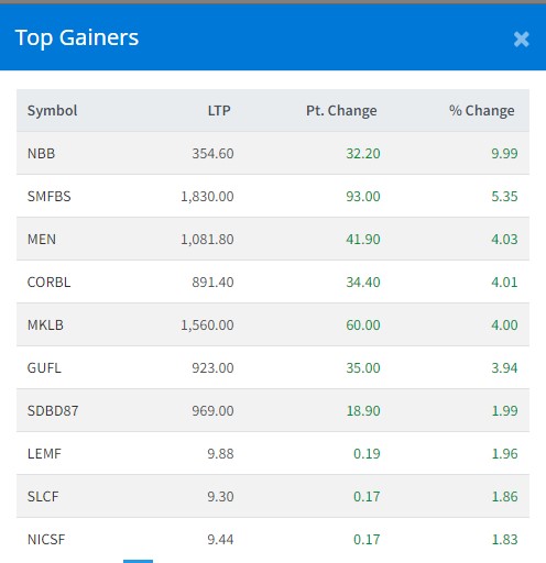 आज नेपाल बङगलादेश बैंकको शेयरमा सकारात्मक सर्किट लागेको छ । त्यस्तै, स्वाभिमान लघुवित्तको ५.३५ प्रतिशत, माउन्टेन इर्नजी नेपालको ४.०३ प्रतिशत, कर्पोरेट डेभलपमेन्ट बैंकको ४.०१ प्रतिशत, मनकामना स्मार्ट लघवित्तको ४ प्रतिशत, गोर्खास फाइनान्सको ३.९४ प्रतिशत र सांग्रिला डेभलपमेन्ट बैंक डिबेञ्चरको १.९९ प्रतिशतले वृद्धि भएको हो ।