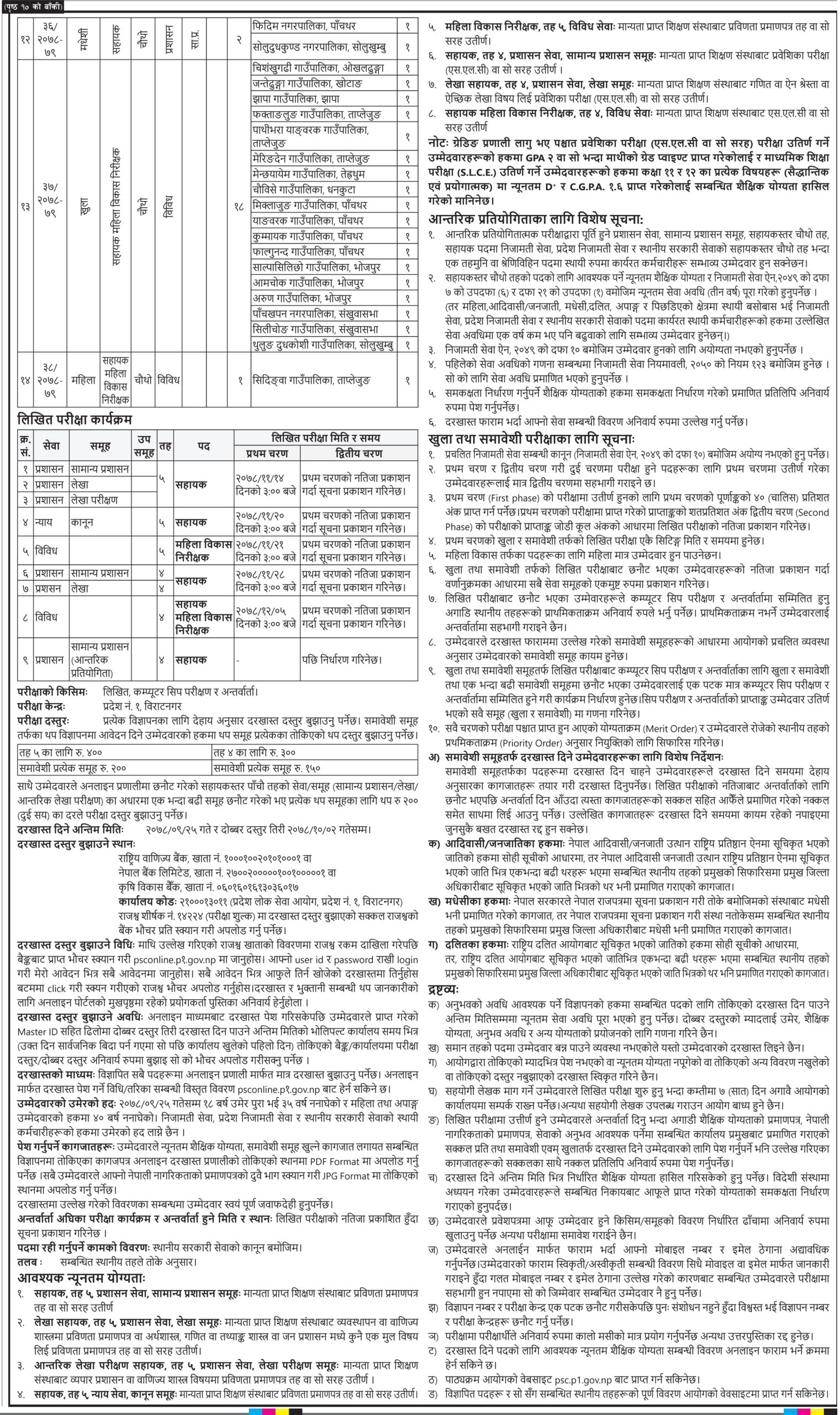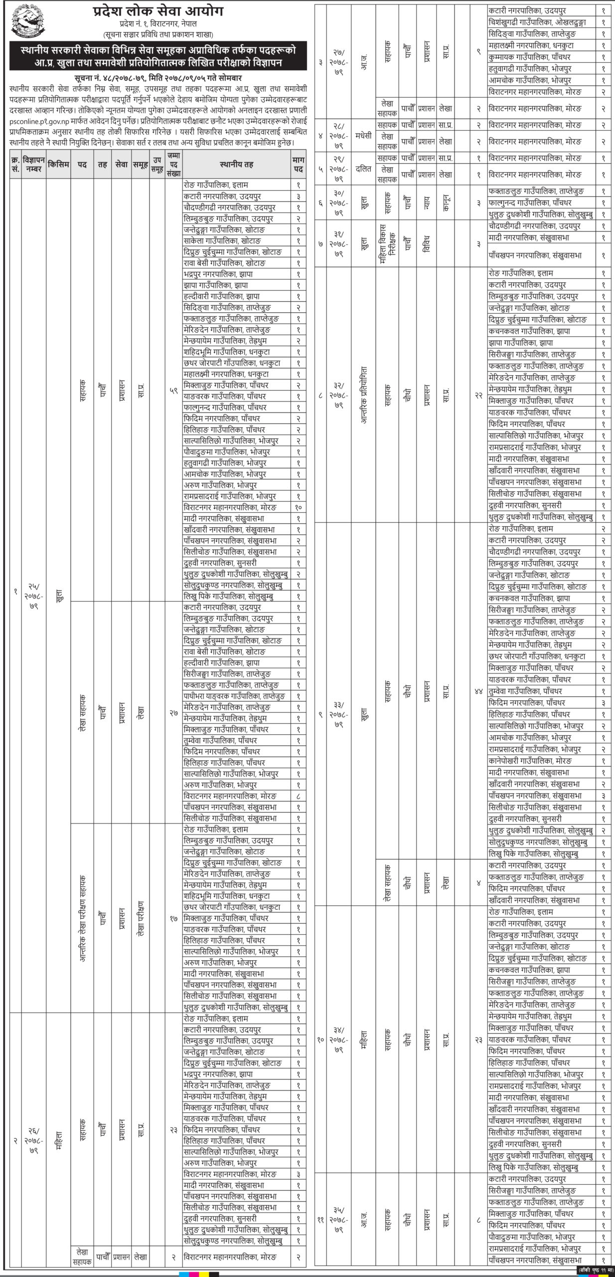 प्रदेश नं. १ को लोक सेवा आयोगले स्थानीय सरकारी सेवा तर्फका विभिन्न सेवा, समूह, उपसमूह तथा तहका पदहरुमा आन्तरिक प्रतियोगिता, खुला तथा समावेशी पदहरुमा प्रतियोगितात्मक परिक्षाद्धारा पदपूर्ति गर्नुपर्ने भएकाले योग्यता पुगेका उम्मेदवारहरुबाट दरखास्त आह्वान गरेको हो ।