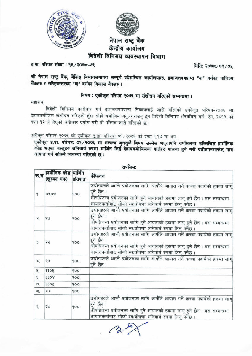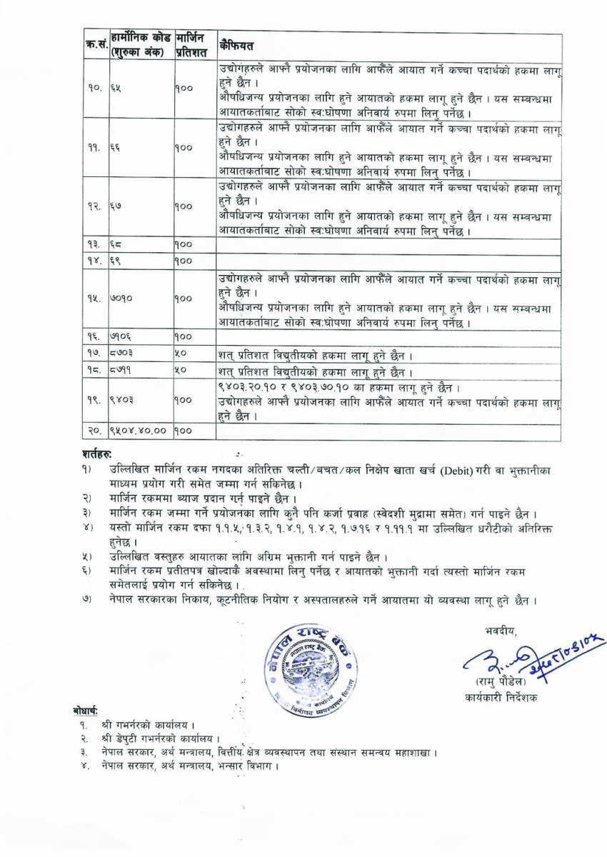 राष्ट्र बैंकले चकलेट, चुइगम, इनर्जी ड्रिङ्क चुरोट, अत्तर परफ्युम, शृङ्गारका सामाग्री, स्याम्पु, कपालमा लगाउने तेल, काठका सामाग्री र फर्निचर, जुत्ता, टोपी, छाता, कृत्रिम फूल, मार्बल, ट्वाइलेट र भान्छाकोठाका सामाग्री, चाँदी, फलामका फर्निचर, प्लास्टिकका फर्निचर जस्ता वस्तु आयातगर्दा शतप्रतिशत मार्जिन बैंकमा राख्नुपर्ने व्यवस्था गरेको हो । त्यस्तै, विद्युतीय बाहेकका सवारी साधन आयात गर्दा ५० प्रतिशत मार्जिन आयातकर्ताले राख्नुपर्ने व्यवस्था गरेको छ ।