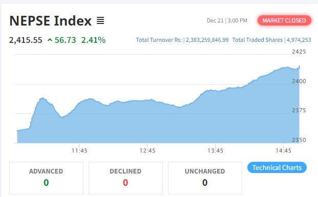 नेप्से परिसूचक २.४१ प्रतिशतले बृद्धि भएर २४१५.५५ विन्दु कायम भएको छ । नेप्सेमा सूचिकृत २२६ कम्पनीको ४९ लाख ७४ हजार २५३ कित्ता शेयर किनबेच हुँदा २ अर्ब ३८ करोड ३२ लाख ५९ हजार ८४६ रुपैयाँको कारोबार भएको छ ।