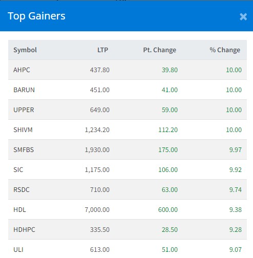 त्यस्तै, हिमालयन डिस्टिलरीको ९.३८ प्रतिशत, हिमाल दोलखा हाइड्रोपावरको ९.२८ प्रतिशत र यूनियन लाइपफ इन्स्योरेन्सको ९.०७ प्रतिशत अंकले बृद्धि भएको छ ।