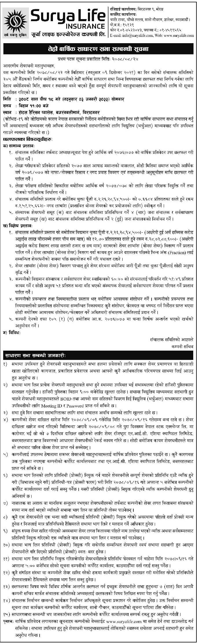 सूर्या लाइफको तेह्रौं साधारण सभा पुष १९ गते, यस्ता छन् एजेण्डा
