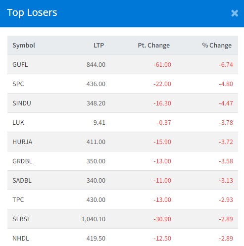 त्यस्तै,, समलिङ पावरको ४.८० प्रतिशत, सिन्धु विकास बैंकको ४.४७ प्रतिशत, लक्ष्मी उन्नति कोषको ३.७८ प्रतिशत, हिमालयन उर्जा विकासको ३.७२ प्रतिशत र ग्रीन डेभलपमेन्ट बैंकको ३.५८ प्रतिशतले घटेको हो ।
