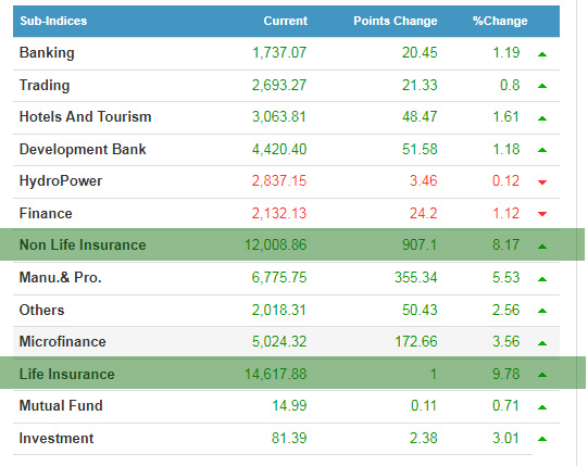 आज सर्वाधिक कमाउने कम्पनीहरुको शीर्ष स्थानमा मध्य भोटेकोशीबाहेक अधिकांश बीमा कम्पनीहरु रहेका छन् । सूची देखिएको थियो । आइतबार १३२ कम्पनीको मूल्य बढेको छ । आज जीवन बीमाको इन्डेक्स पनि ९.७८ प्रतिशत बढेर १४ हजार ६१७ पुगेको भने निर्जीवन बीमाको इन्डेक्स ८.१७ प्रतिशत बढेर १२ हजार ८ रुपैयाँको बिन्दुमा पुगेको छ ।