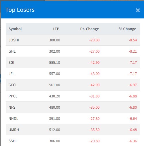 नेप्से राताप्मे हुदाँ आज सर्वाधिक गुमाउने कम्पनीहरुमा जोशी हाइड्रोपावरको ८.५४ प्रतिशत, घलेम्दी हाइड्रोको ८.२१ प्रतिशत, सानिमा जनरल इन्स्योरेन्सको ७.१७ प्रतिशत, जानकी फाइनान्सको ७.१७ प्रतिशत, गुडवइल फाइनान्सको ६.९७ प्रतिशत, पाँचथर पावरको ६.८८ प्रतिशत र नेपाल फाइनान्सको ६.८० प्रतिशतले घटेको छ ।