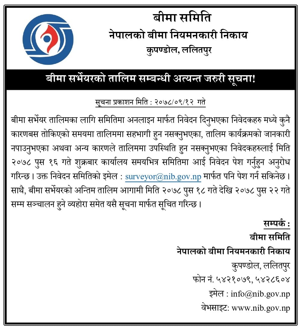 उक्त तालिममाा सहभागि हुन चाहने निवेदकहरुले पुस १६ गतेसम्म समितिको इमेल मार्फत पेश गर्न सक्नेछन् । बीमा सर्भेयरको अन्तिम तालिम पुस १८ गतेदेखि पुस २२ गते बाट हुने समितिले जनाएको छ ।
