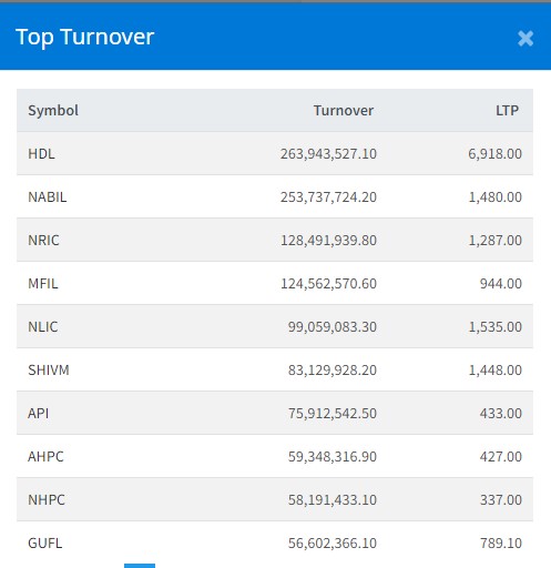 आइतबार र सोमबार ५ अर्बमाथिको कारोबार हुँदा आज ३ अर्बमाथि कारोबार खुम्चिएको छ । सोही रुपैयाँ बराबरको कारोबार हुँदा आज सर्वाधिक कारोबार हुने कम्पनीमा हिमालयन डिस्टिलरी रहेको छ । कम्पनीको आज एकैदिन २६ करोड ३९ लाख ४३ हजार ५२७ रुपैयाँको कारोबार भएको छ ।