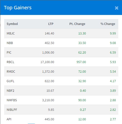 त्यस्तै, नेपाल बङगलादेश बैंकको ९.०८ प्रतिशत, प्रिमियर इन्स्योरेन्सको ६.५९ प्रतिशत, राष्ट्रिय बीमा कम्पनीको ५.९३ प्रतिशत, आरएमडिसी लघुवित्तको ५.५४ प्रतिशत र गोर्खास फाइनान्सको ४.१७ प्रतिशतले वृद्धि भएको हो ।