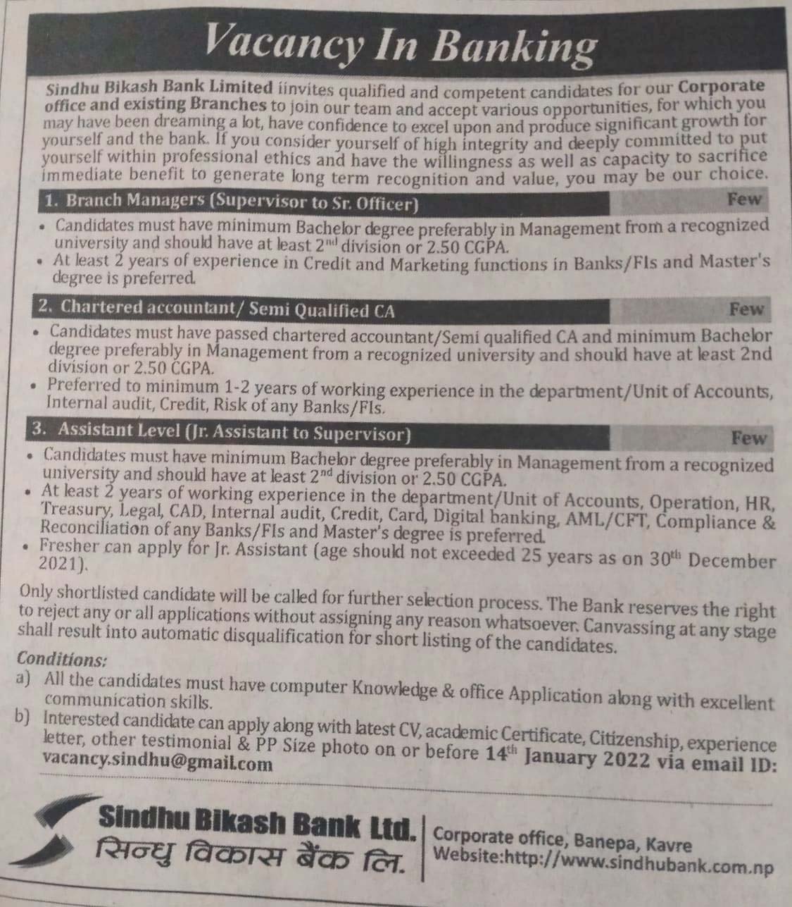 बैंकले ब्रान्च म्यानेजर, चार्टर्ड अकाउन्टेन्ट र असिस्टेन्स लेभलमा केही संख्यामा कर्मचारी माग गरेको हो । योग्यता पुगेका इच्छुक ब्यक्तिले पुस ३० गतेसम्म आवश्यक कागजात संकलन गरी बैंकको इमेल मार्फत आवेदन दिन सक्नेछन् ।