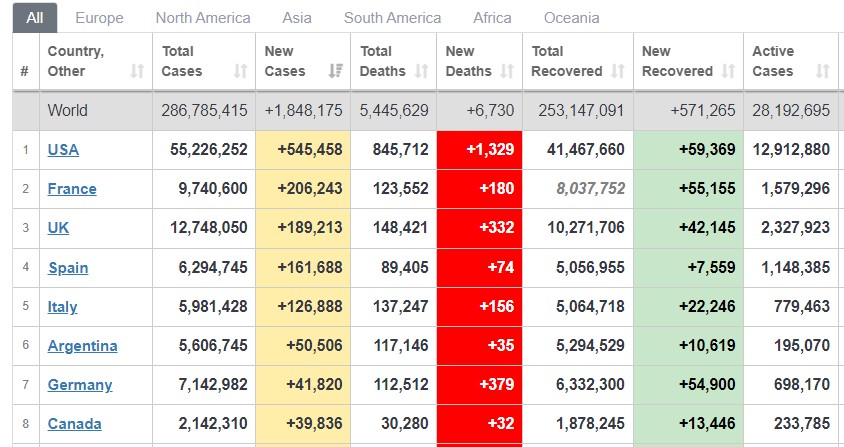 कोरोना भाइरसको तथ्याङ्क सम्बन्धी वेभसाईट वल्डोमिटर्सका अनुसार अमेरिकामा पछिल्लो २४ घण्टामा मात्रै एक हजार ३२९ जनाको मृत्यु भएको छ । हालसम्म अमेरिकामा संक्रमण हुनेको संख्या पाँच करोड ५२ लाख २६ हजार २५२ पुगेको छ भने कूल मृत्यु हुनेको संख्या आठ लाख ४५ हजार ७१२ जना रहेको छ ।