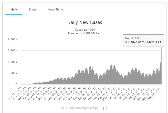 काठमाडौं । कोरोना महामारीमा पछिल्लो समय देखिएको ओमिक्रोन भेरियन्टले विश्व पुनः असामान्य अवस्थातर्फ फर्कदैछ । पछिल्लो २४ घण्टामा हालसम्मकै उच्च १६ लाख ४४ हजार ११४ जनामा कोरोना भाइरस पुष्टि भएको छ । तथ्याङ्क सम्बन्धी वेभसाईट वल्डोमिटर्सका अनुसार यसअघिको १० लाख दैनिक संक्रमणको अवस्थाबाट हिजो ह्वात्तै बढेको हो । यद्यपि मृत्युदर भने उच्चभएको छैन । पछिल्लो २४ घण्टामा विश्वभरमा कोरोनाबाट मृत्यु हुनेको संख्या सात हजार ४२६ रहेको छ ।