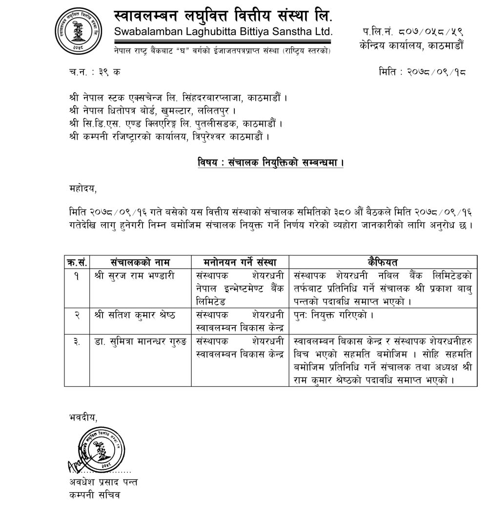 काठमाडौं । स्वावलम्बन लघुवित्त वित्तीय संस्था लिमिटेडले संचालक नियुक्त गरेको छ । कम्पनीको पुष १६ गते बसेको संचालक समितिको बैठकले ३ जना संचालक चयन गरेको हो ।