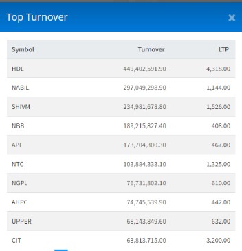 कम्पनीको आज एकैदिन ४४ करोड ९४ लाख २ हजार ५९१ रुपैयाँको कारोबार भएको छ। त्यस्तै, नबिल बैंकको २९ करोड ७० लाख, शिवम् सिमेन्ट्सको २३ करोड ४९ लाख, नेपाल बैंगलादेश बैंकको १८ करोड ९२ लाख र अपि पावर कम्पनीको १७ करोड ३७ लाख भन्दा माथिको कारोबार भएको छ ।